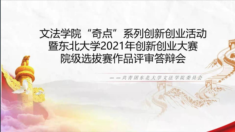 为进一步激发我校师生的创新创业热情,搭建师生创新创业项目与社会投资对接平台,鼓励学生在创新创业中增长智慧才干,磨炼意志品质,把激昂的青春梦融入到伟大的中国梦,学校组织学生参加东北大学2021年创新创业大赛。文法学院团委积极动员学生参与。参赛作品达50项,累计人数达336人。