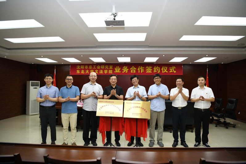 2021年7月12日,东北大学文法学院与沈阳市总工会签订《沈阳市总工会研究室与东北大学文法学院开展业务合作协议书》,并举行“工会理论研究与学术活动基地”“社会实践教学科研基地”揭牌仪式。签约仪式上,东北大学文法学院副院长杜宝贵教授和沈阳市总工会研究室主任樊喜武同志签订协议书,东北大学文法学院院长张雷教授和沈阳市总工会李世勇副主席助签。