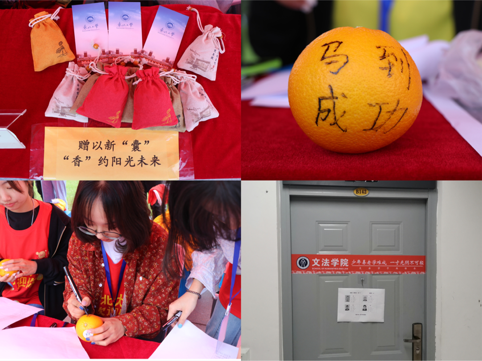 以传统文化为基,充分体现学院特色。含有祝福语的香囊会给初来乍到的新生送去美好祝愿,同时也取留香之意,希望新同学们能保留这份美好,这份初心;“橙意满满”的阳光鲜橙,刻上含有新生名字的祝福成语,为大学生活注入第一抹活力;富有诗意的寝室古谚语门贴,将象征阳光文法的橙色和古韵花纹融合,既是文法寝室的显著标识,也是文科学生独有的精神彰显。一份份温暖和鼓励,帮助大一新生在学业过渡期不再无助与困惑,也延续了文法大家庭和谐友爱、团结互助的优良传统。