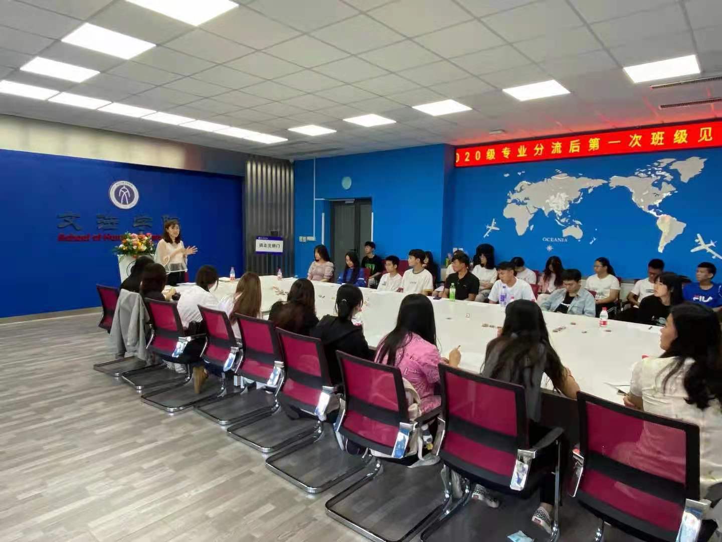 近日,文法学院2020级本科生专业分流后第一次班级见面会暨班委竞选大会在文管学馆A210顺利举行。会议由2020级本科生辅导员蔡晓淇主持,事业2001班、法学2001班、行政2001班、土管2001班、新闻2001班全体学生依次参会。