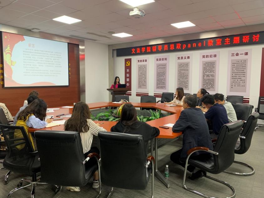 为做好高校立德树人工作,加强辅导员队伍的理论研究,提高育人工作水平,9月26日下午16:00,文法学院在文管学馆A202会议室开展“辅导员思政panel教室”主题研讨,文法学院党委副书记、副院长夏风云及学生工作办公室全体成员、兼职辅导员参加了此次活动,兼职辅导员赵界结合《习近平在庆祝中国共产党成立100周年大会上的讲话》,围绕如何增强新时代大学生的使命担当进行了主题报告。