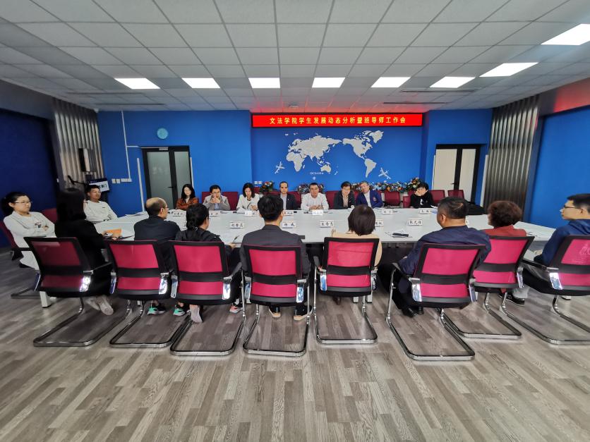 9月29日10:30,文法学院学生发展动态分析暨班导师工作会议于文管学馆A210召开。文法学院党委书记隋永强,党委副书记兼副院长夏风云,各专业负责人与各年级班导师参加此次会议,学生工作办公室主任甘霖主持本次仪式。