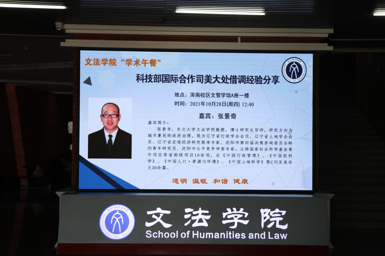 2021年10月28日中午,东北大学首届研究生学术文化节之“研师讲坛”系列学术讲座活动文法学院“学术午餐”在文管学馆A座一楼举行,文法学院党委书记隋永强,文法学院副院长李丹,团委书记兼2020级本科生辅导员蔡晓淇,研究生辅导员兼2018级本科生辅导员姜冬以及部分师生参加了此次活动。
