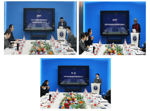 会议第二项,社会稳定风险评估中心成立仪式。社会稳定风险评估中心由东北大学国家治理研究院与沈阳市法学会宪法行政法学研究会共建,其目的是整合双方优势,建立高端智库。东北大学国家治理研究院主任曹海军、沈阳市法学会宪法行政法学研究会副会长姚天冲、沈阳市信访局风险评估和排查处处长夏洁就社会稳定风险评估中心成立的背景、意义分别发表观点。