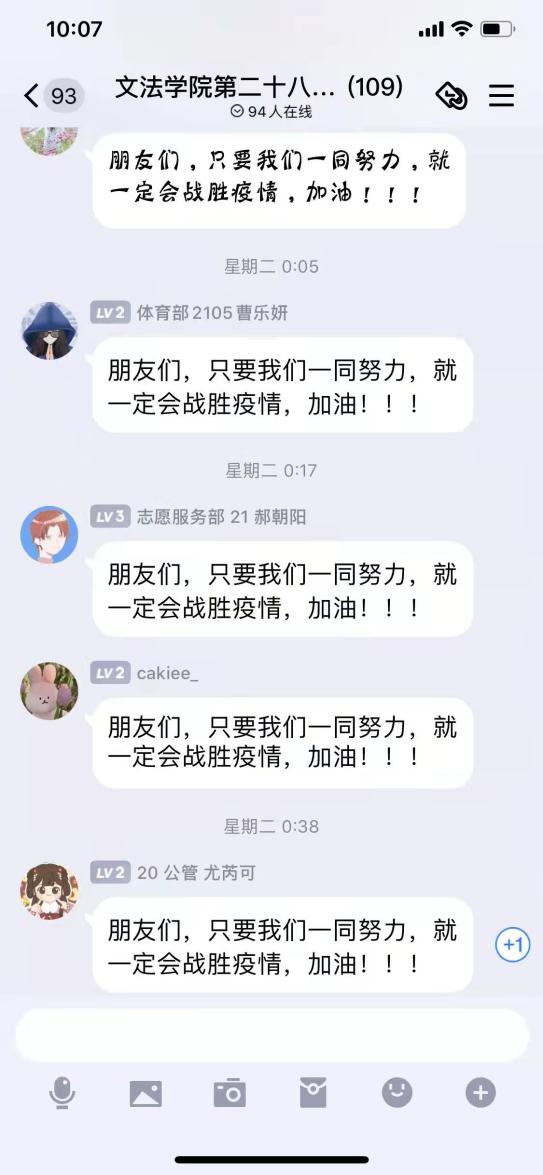 图14 学校封闭管理当日午夜文法学院学生在志愿者群内彼此激励