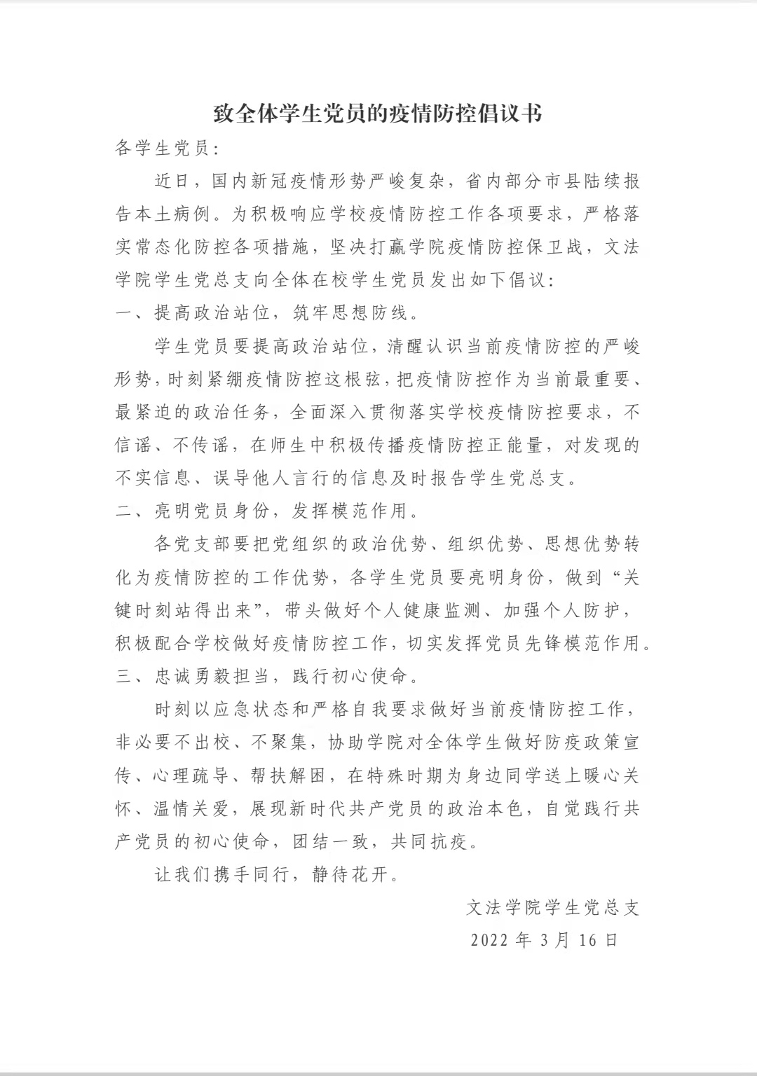 文法学院党委、团委先后发布《致全体学生党员的疫情防控倡议书》《致文法学院团员、青年学生的防疫倡议书》等,要求广大党员干部提高政治站位、强化使命担当,带头做好疫情防控工作,坚决打赢疫情防控阻击战。学院各级党组织积极响应学校《关于招募疫情防控志愿者的通知》,文法学院学生在群内积极响应,仅两个小时征集学生志愿者205名。党员学生干部积极报名参与,把此次志愿服务作为守初心、担使命的试金石和磨刀石,以青年之自觉、青年之担当、青年之作为,配合学校筑牢疫情防线,守护平安校园!