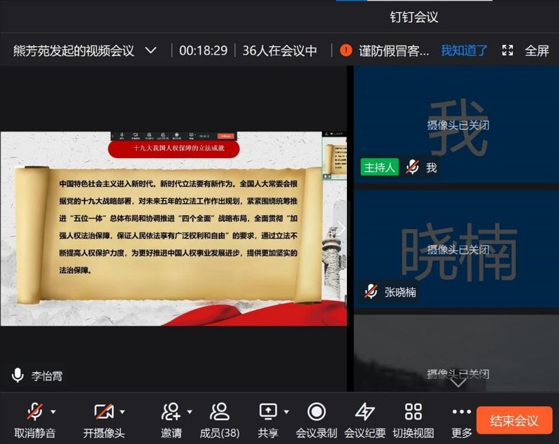 为弘扬法治精神,全面总结文硕2002党支部“学习立法发展史,宣法传策惠民生——‘学党史 践使命 传精神’”系列活动,近日,文硕2002党支部在钉钉平台开展“新中国立法发展史学习成果展示”活动。活动由党支部书记熊芳苑主持,支部全体党员及入党积极分子参加。