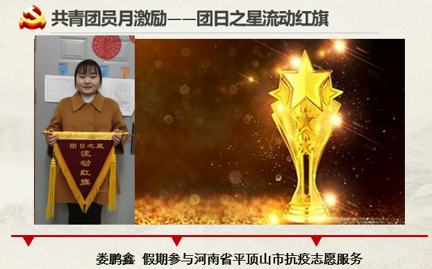 “雷锋精神,人人可学;奉献爱心,处处可为。”广大团员青年要把崇高的理想信念和道德品质追求融入日常的学习生活中,从眼前做起,从小事做起,传承雷锋精神。在当前新冠肺炎疫情波动形势下,土管2001支部按例开展“共青团员月激励——团日流动红旗”的特色品牌活动,在各位老师的见证下,线上给予支部内参与河南省平顶山市抗疫志愿服务的娄鹏鑫同志以流动红旗。
