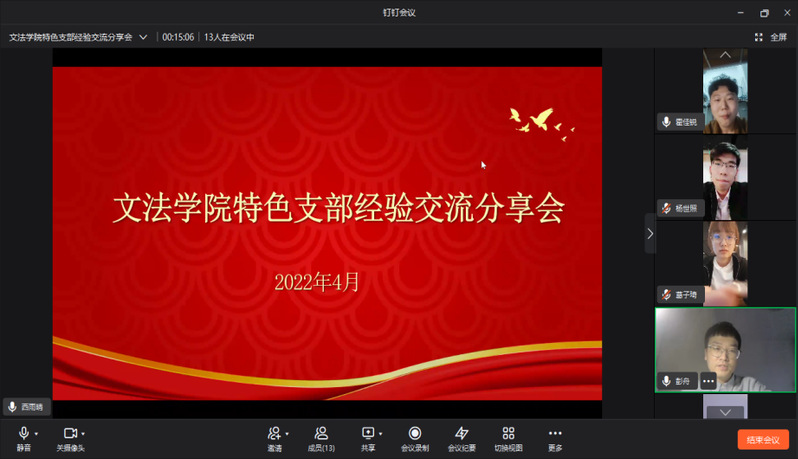 2022年4月14日18:00,文法学院特色支部经验交流分享会在钉钉线上举行,会议由党委组织员彭舟主持,各学生党支部书记参加本次会议。