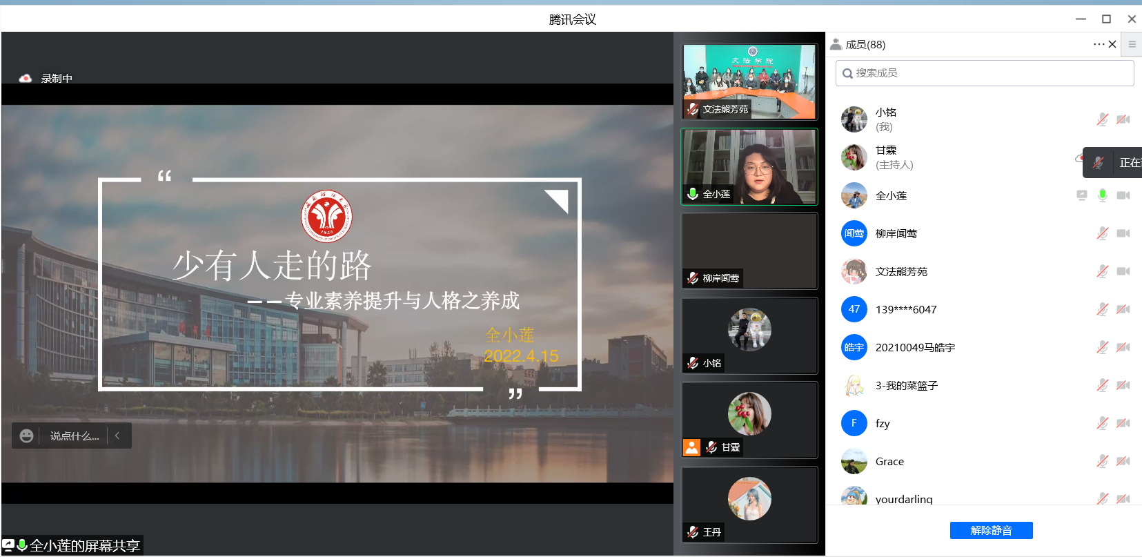 全小莲以斯科特·派克的名篇《少有人走的路》引出话题,结合自身学习及就业经历,点出人生之中选择的重要性,并通过多维度的分析为同学们在求学、升学、就业等不同时间段提供经验与建议,鼓励同学们努力提升专业素养,把握住人生每一次选择带来的机遇。