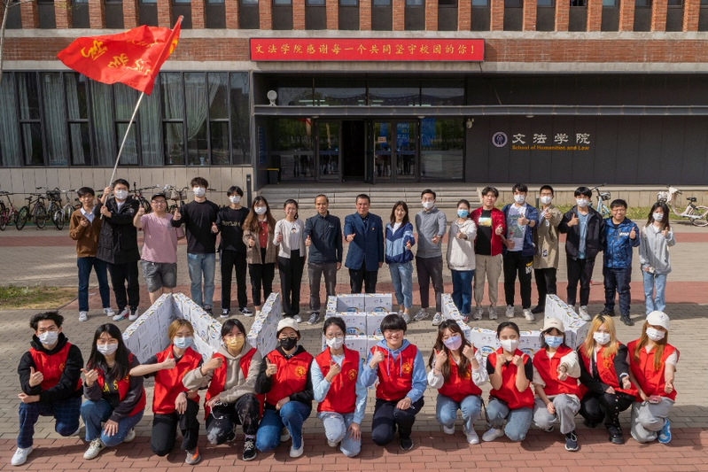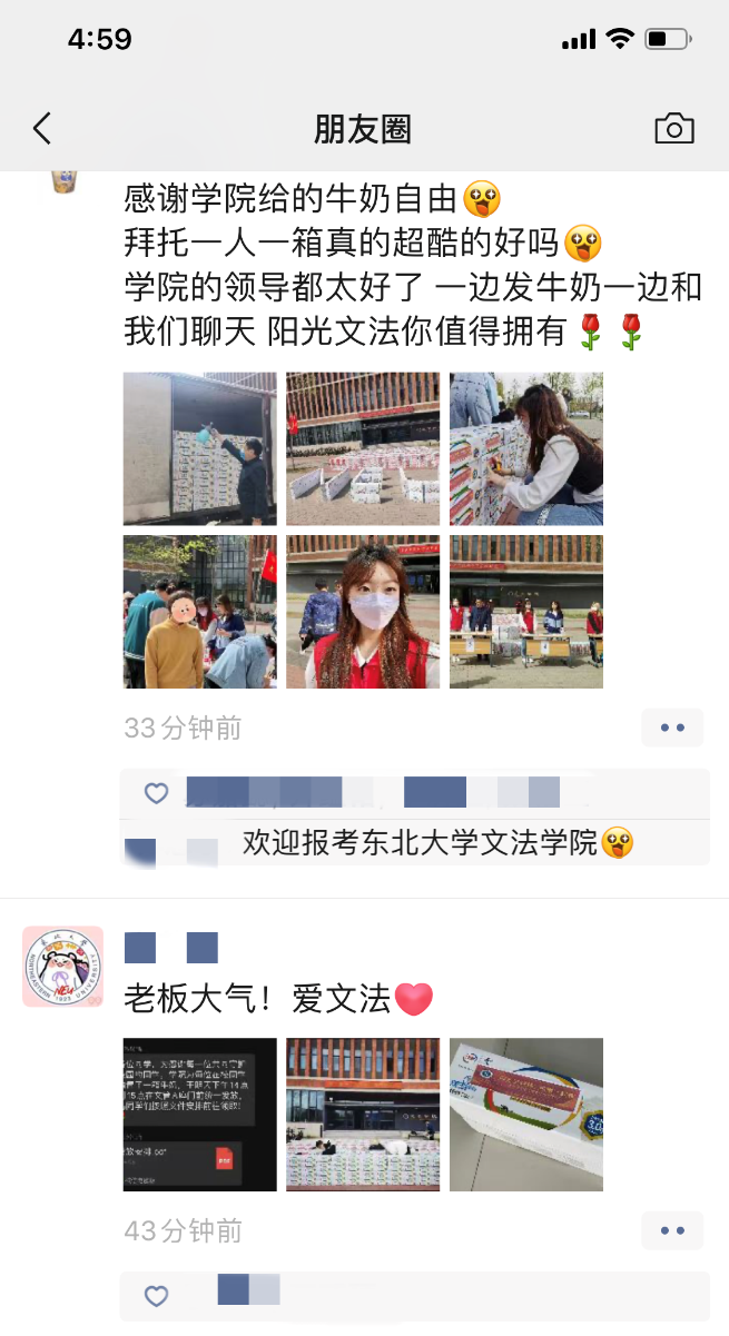 4月30日,文法学院在文管学馆门前为全院在校学生每人分发一箱牛奶作为五一劳动节慰问品,学院党委书记隋永强,副书记、副院长(兼)夏风云及驻校辅导员亲自将牛奶发到每一名学生手里,给学生送去学院的祝福,表达了学院对全体学生积极配合学校疫情防控工作的感谢。