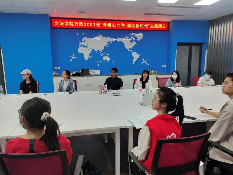 6月4日,文法学院副院长杜宝贵在文管学馆A210室参加行政2001班“青春心向党・建功新时代”主题团日之读书分享会,本次分享会以线上线下相结合的方式开展。文法学院团委书记兼20级本科生辅导员蔡晓淇、东北大学“学习报国”宣讲团宣讲员蔡秉淑及行政2001班全体学生参与活动。
