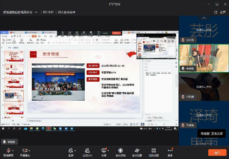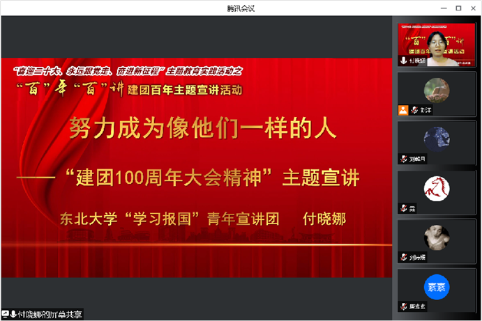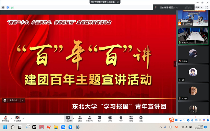 2022年6月4日14:00,行政2001团支部召开主题团日活动,严格按照东北大学校园疫情防控相关要求,采取线上腾讯会议及读书分享会的形式进行深入学习,文法学院副院长杜宝贵,文法学院团委书记兼2020级本科生辅导员蔡晓淇莅临指导。同时,团支书带领同学们开展“庆祝中国共产主义青年团成立100周年大会”专题学习,进行视频了解、材料研读,邀请东北大学“学习报国”青年宣讲团成员蔡秉淑宣讲,更有重温誓词、青年运动等活动充分鼓励支部成员学思践悟大会精神;杜宝贵老师在会后进行总结分享,同学们收获颇丰,青年团员们在学习过程中展现了当今青年人知行合一的担当。