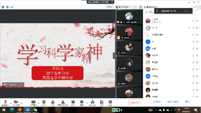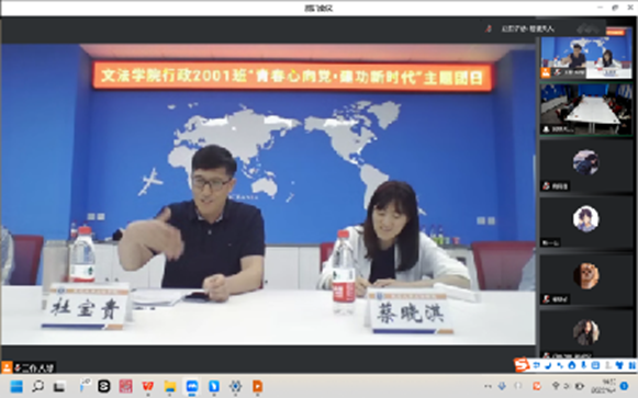 2022年5月27日14:30,事业2001团支部召开线上主题团日活动,文法学院公共事业管理系主任王光、文法学院团委书记兼2020级本科生辅导员蔡晓淇、研习社青年讲习师唐鲁宁以线上会议的形式进入支部。同学们通过研习社青年讲习师唐鲁宁“追求真理,追求进步”为题的宣讲、重温入团誓词、科学家精神丛书分享会等形式,牢记中国青年运动的光荣传统和光辉主题,体会科技工作者在长期科学实践中积累的宝贵精神财富。同时,王光老师和蔡晓淇老师都发表了精彩讲话使同学们对公共事业管理专业和自身未来发展都有了更明确的定位。