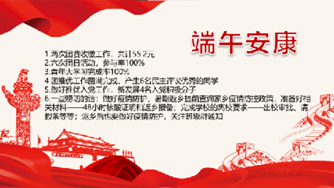 为深入学习贯彻习近平总书记在庆祝中国共产主义青年团成立100周年大会上的重要讲话精神、引领青年勇担社会主义建设的时代使命,行政1901团支部细致筹划,于2022年6月1日开展“青春心向党·建功新时代”主题团日活动。基于疫情防控需要,活动采取线上会议形式,通过组织观看庆祝中国共产主义青年团成立100周年大会的视频资料、以寝室为单位进行学习感悟分享、知识竞赛等方式鼓励同学们深入学习。本次团日提高了团支部的凝聚力,坚定了团员青年的理想信念,筑牢了团员青年的思想根基,团日效果显著。