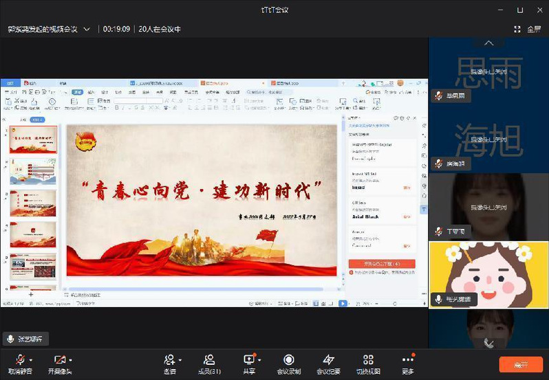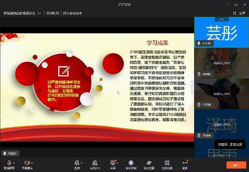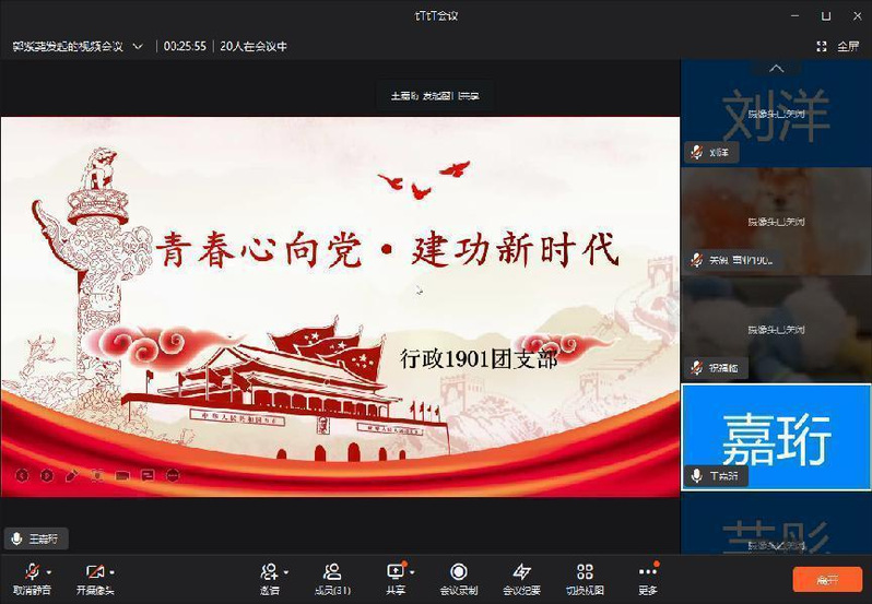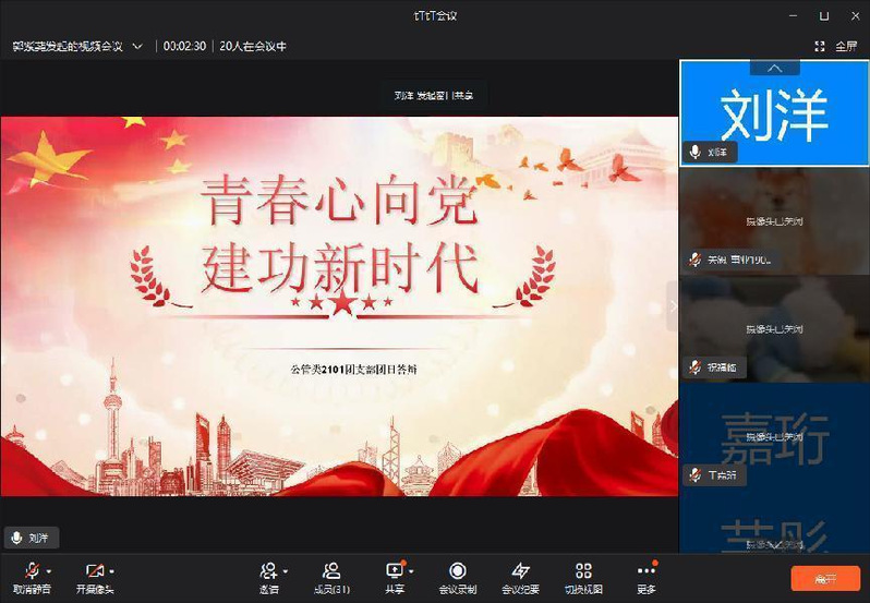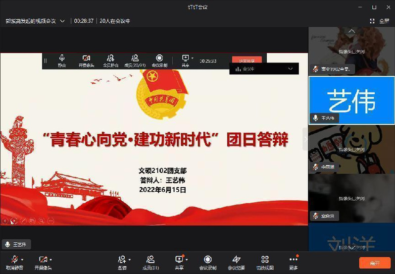 公管类2101团支部在2022年6月6日于腾讯会议线上开展“青春心向党·建功新时代”主题团日,支部全体团员参会。通过学习习近平总书记重要讲话精神、观看党领导下的青年运动视频、组织“四史”知识竞答、邀请东北大学“学习报国”青年宣讲团成员作报告等方式引导广大青年从学习中感悟马克思主义真理力量,树立共产主义远大理想和中国特色社会主义共同理想;牢牢把握培养社会主义建设者和接班人的根本任务;引导团员积极感悟奉献、爱国、创新、育人、求实、协同的科学家精神内涵。综上,团日圆满结束。