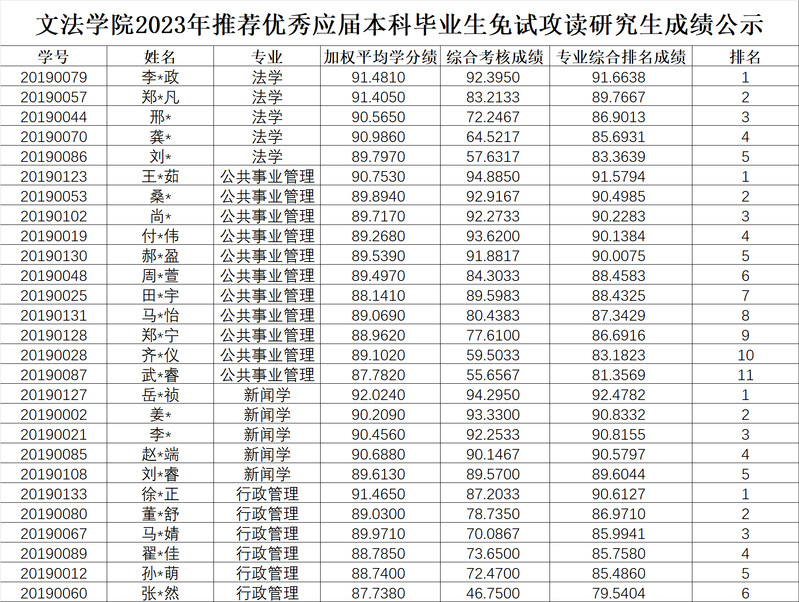 文法学院2023年推荐优秀应届本科毕业生免试攻读研究生成绩公示
