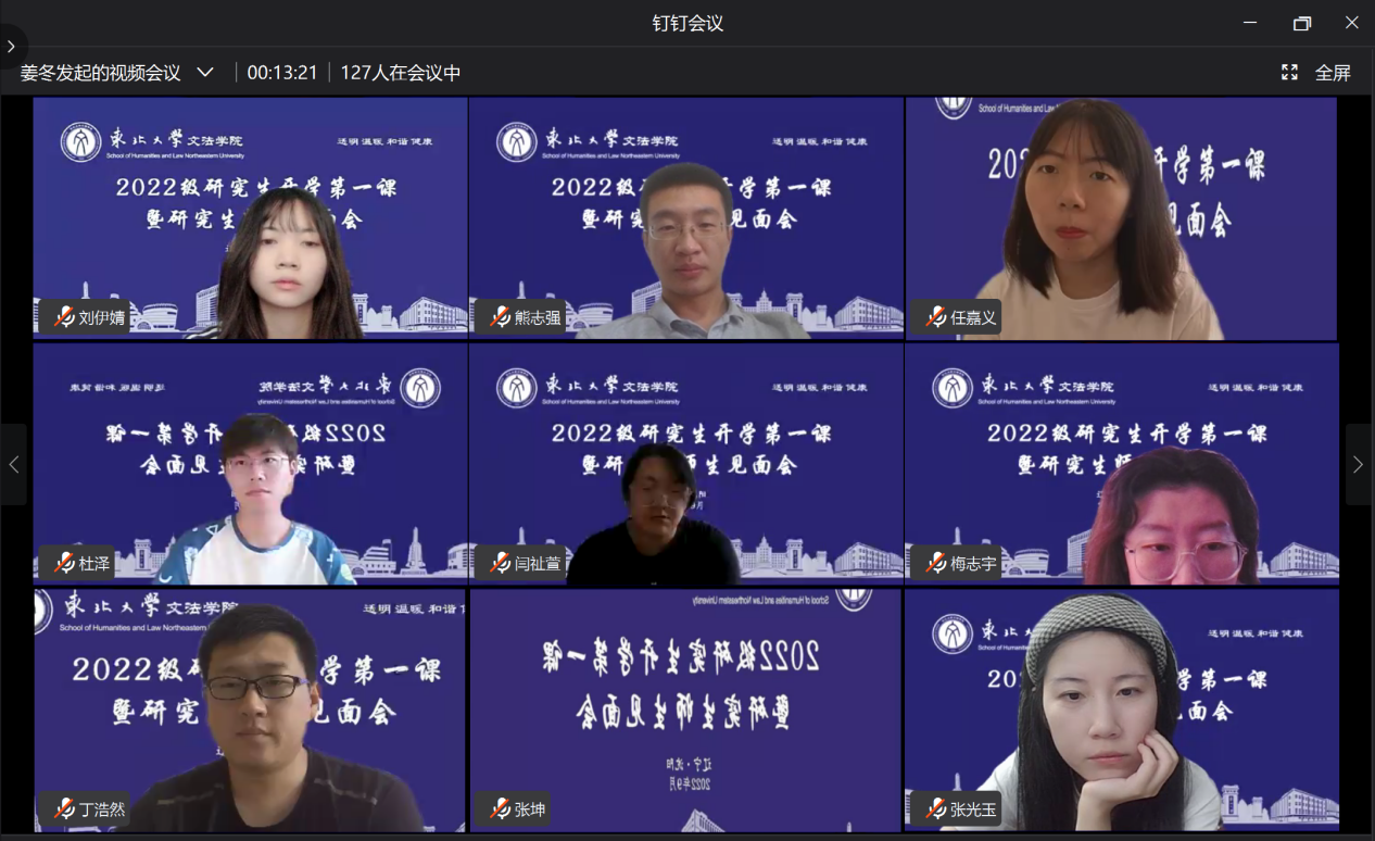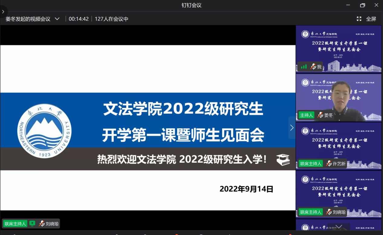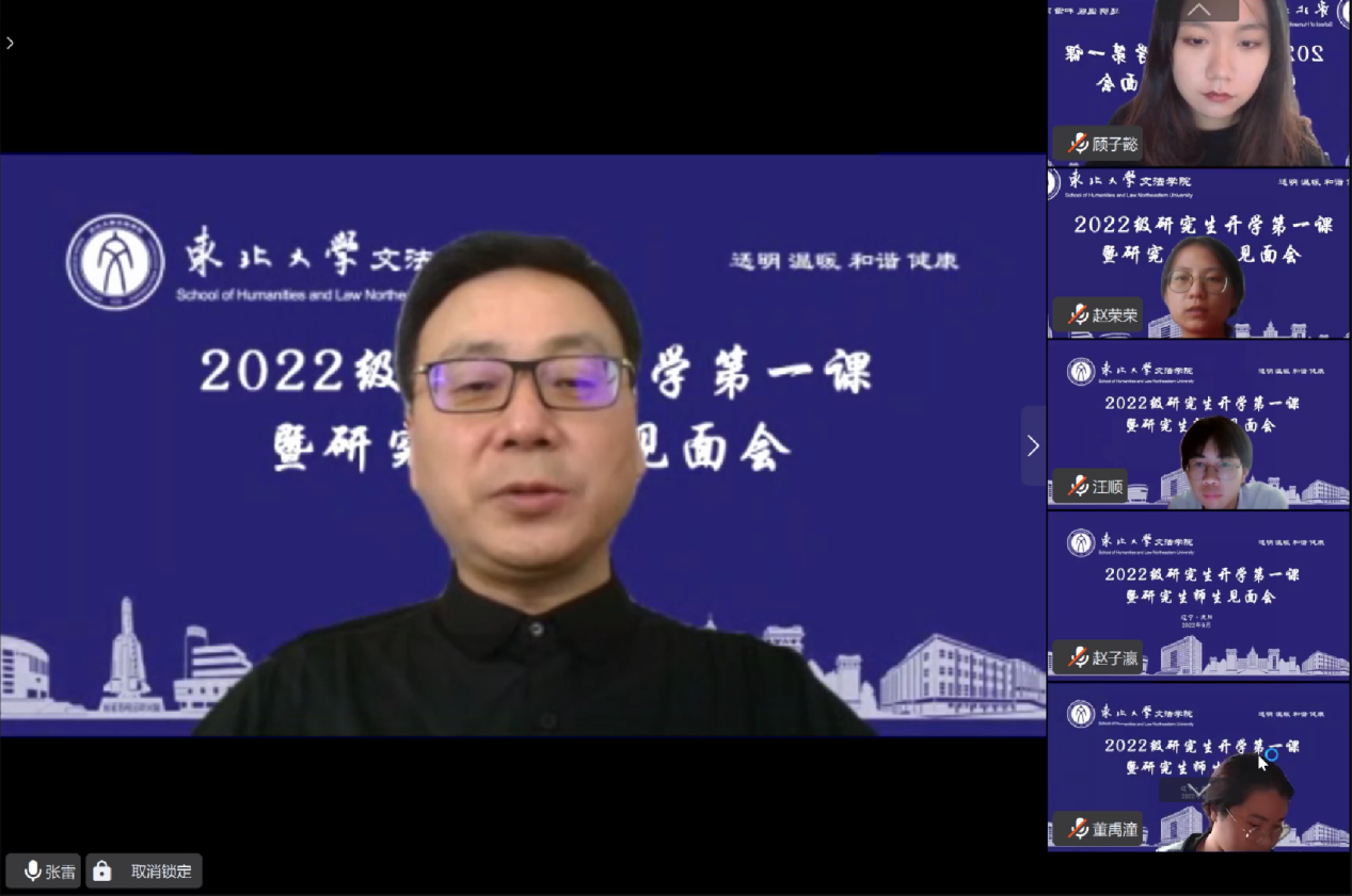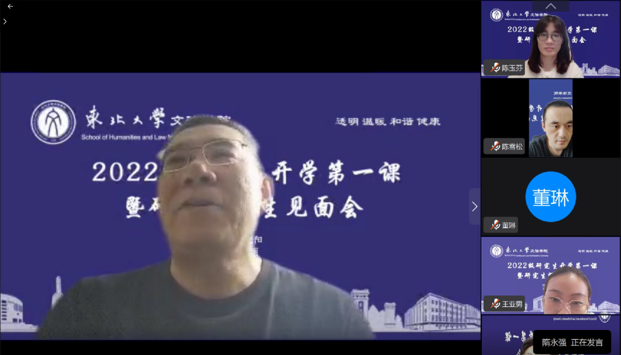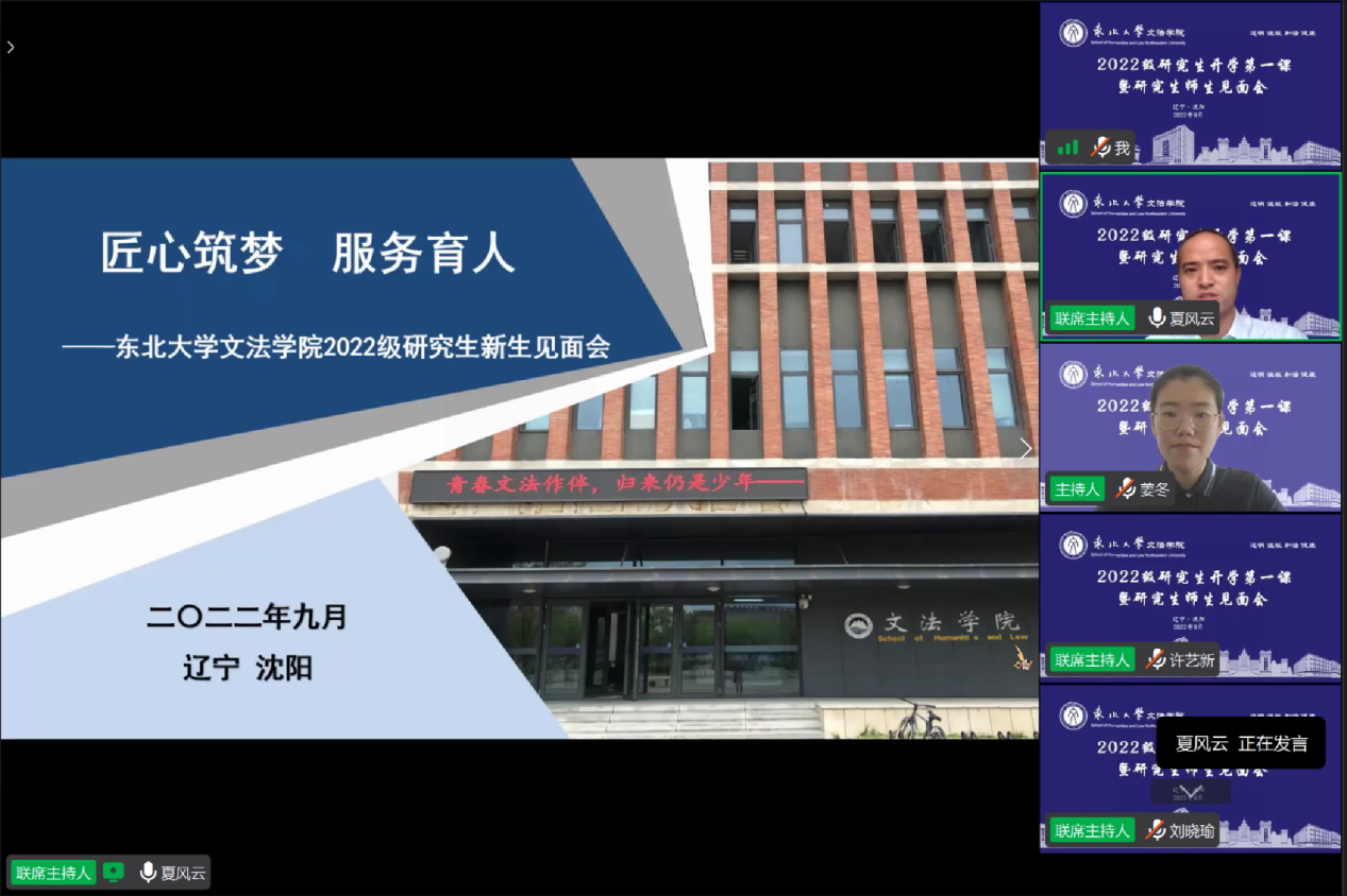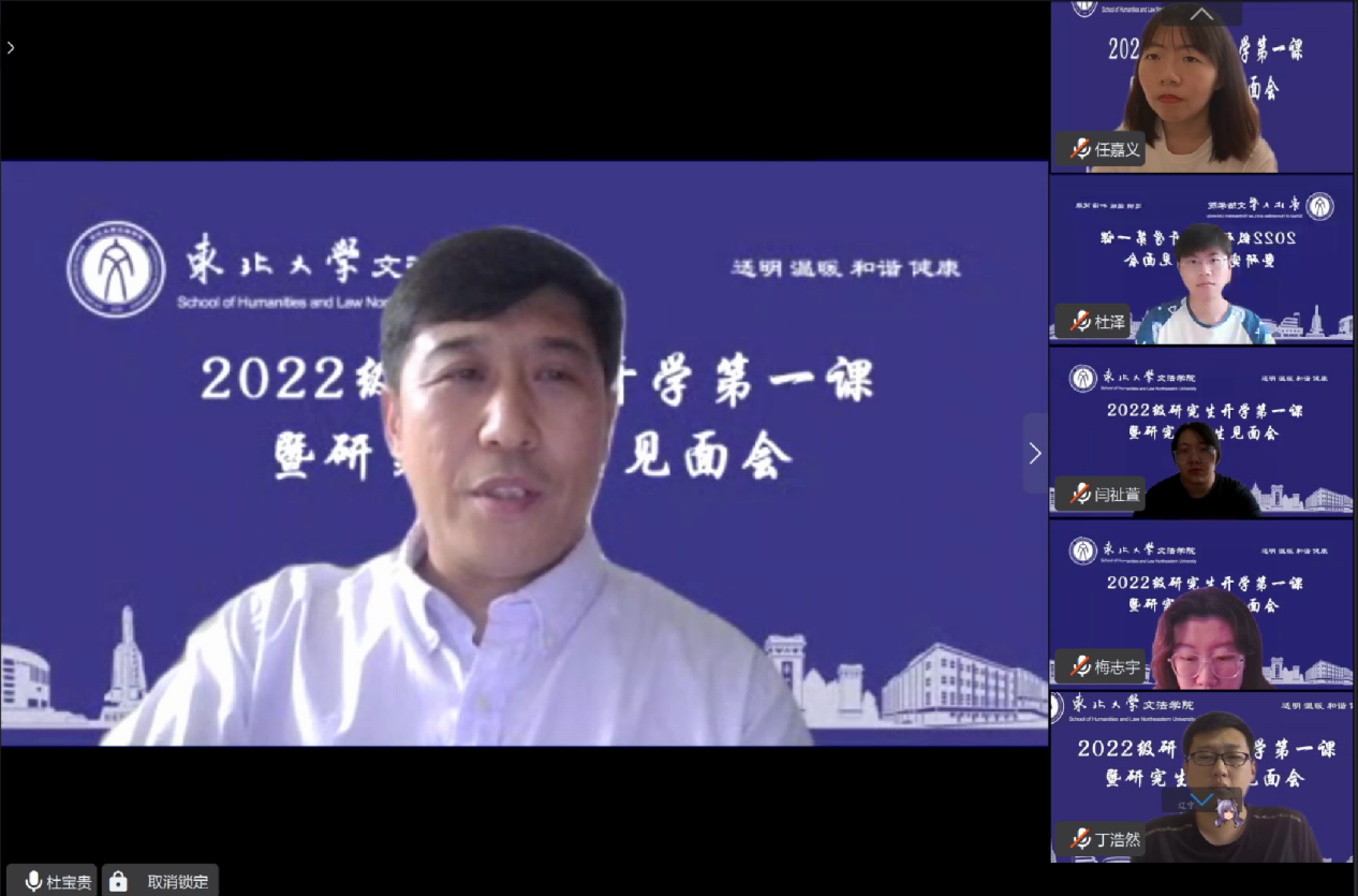 2022年9月14日,文法学院2022级研究生“开学第一课暨研究生师生见面会”在线上举行。文法学院党委书记隋永强,院长张雷,副院长杜宝贵,党委副书记兼副院长夏风云,各系所主任及机关老师出席会议。