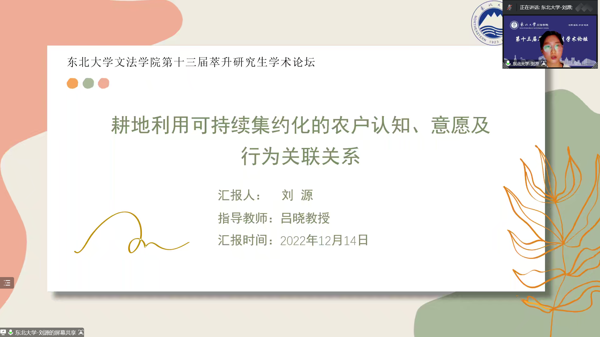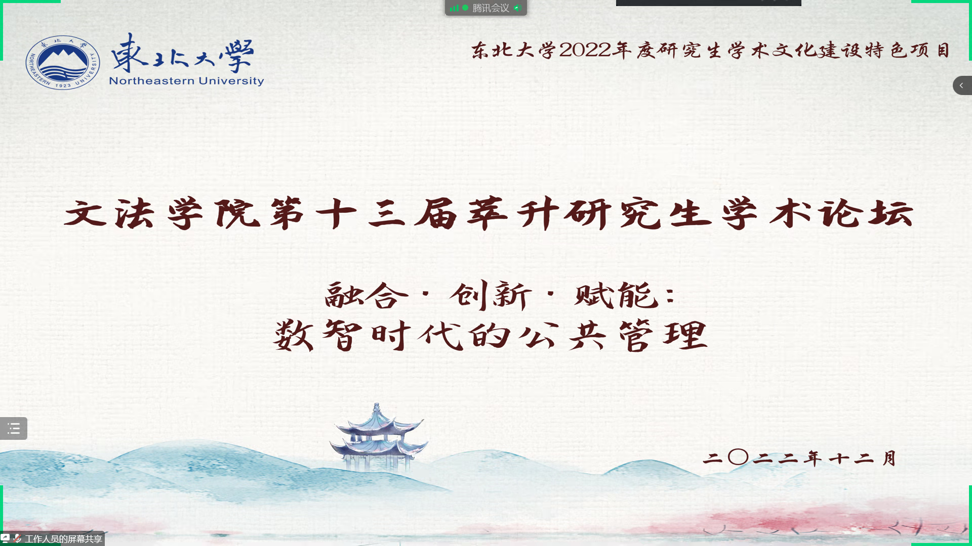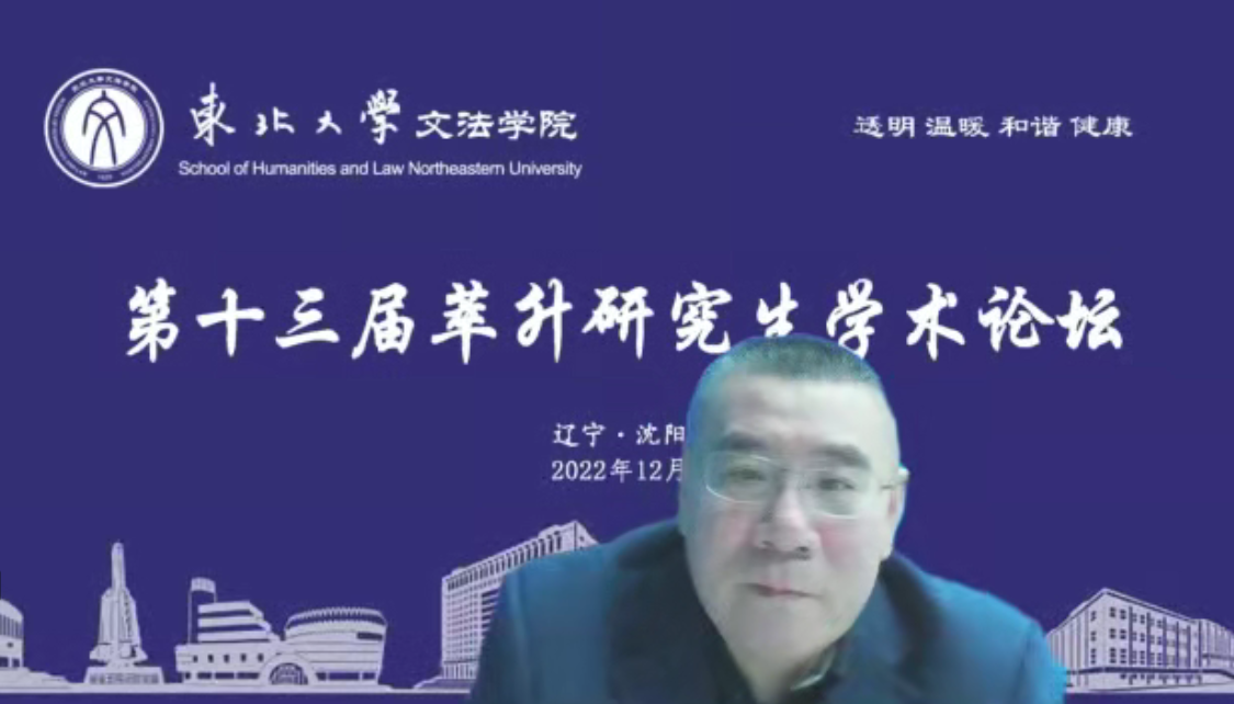 2022年12月14日,东北大学文法学院第十三届萃升研究生学术论坛在线上成功举办。文法学院院长、东北大学跨文化战略研究院院长张雷,文法学院党委书记隋永强,文法学院党委副书记兼副院长夏风云,文法学院博士点建设责任教授雷国平,文法学院学生工作办公室主任、2019级本科生辅导员甘霖,文法学院团委书记、2020级本科生辅导员蔡晓淇,文法学院研究生辅导员兼2022级本科生辅导员姜冬,获奖同学代表及2022级全体硕士研究生参加了此次论坛。