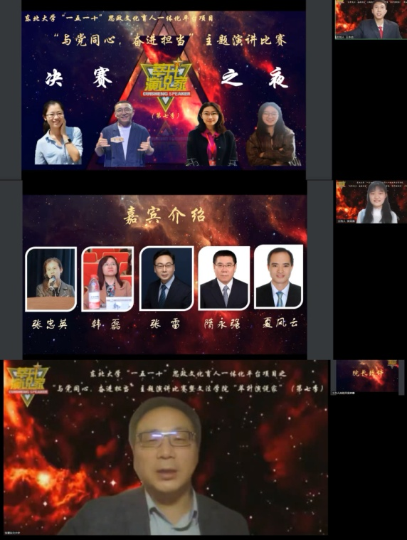 2022年12月17日晚18:30,东北大学“一五一十”思政文化育人一体化平台项目活动之“与党同心,奋进担当”主题演讲比赛暨第七季“萃升演说家”决赛通过腾讯会议在线上举行,至此,为期两个月的“萃升演说家”(第七季)活动圆满落幕。沈阳广播电视台全媒体公共服务事业部主任、辽宁音乐广播总监杨曼,辽宁电视台节目主持人、东北大学校友楚君,北京师范大学国际中文教育学院党委副书记、全国首批最美高校辅导员、第八届全国高校辅导员年度人物任雅才,东北大学团委副书记张忠英,学生工作处副处长韩磊,文法学院院长、东北大学跨文化战略研究院院长张雷,文法学院党委书记隋永强,党委副书记兼副院长夏风云出席了本次活动。