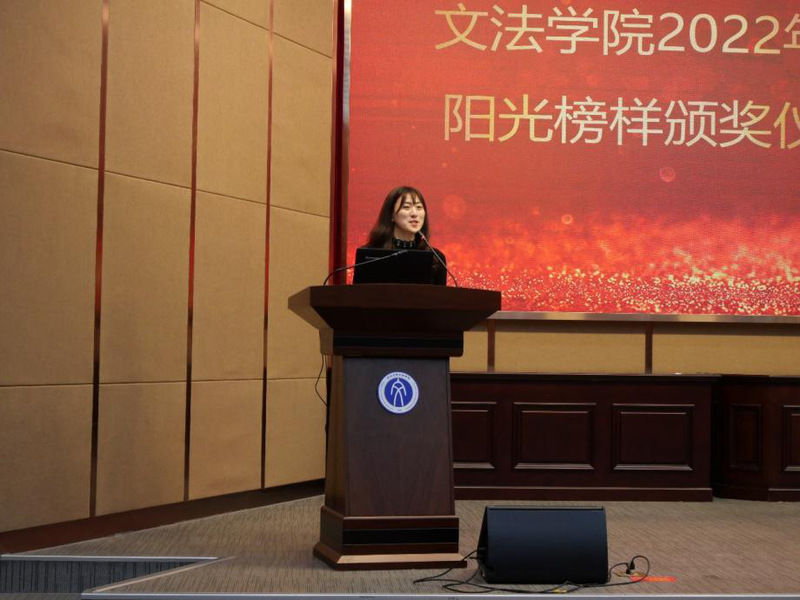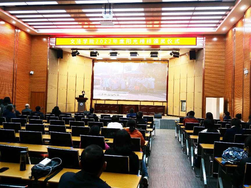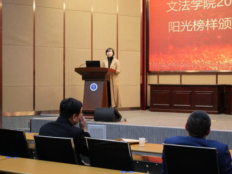 会上,通过视频回忆了过去一年文法学院走过的不平凡的岁月。院长张雷宣读阳光榜样颁奖辞,院党委书记隋永强为获奖者颁奖。