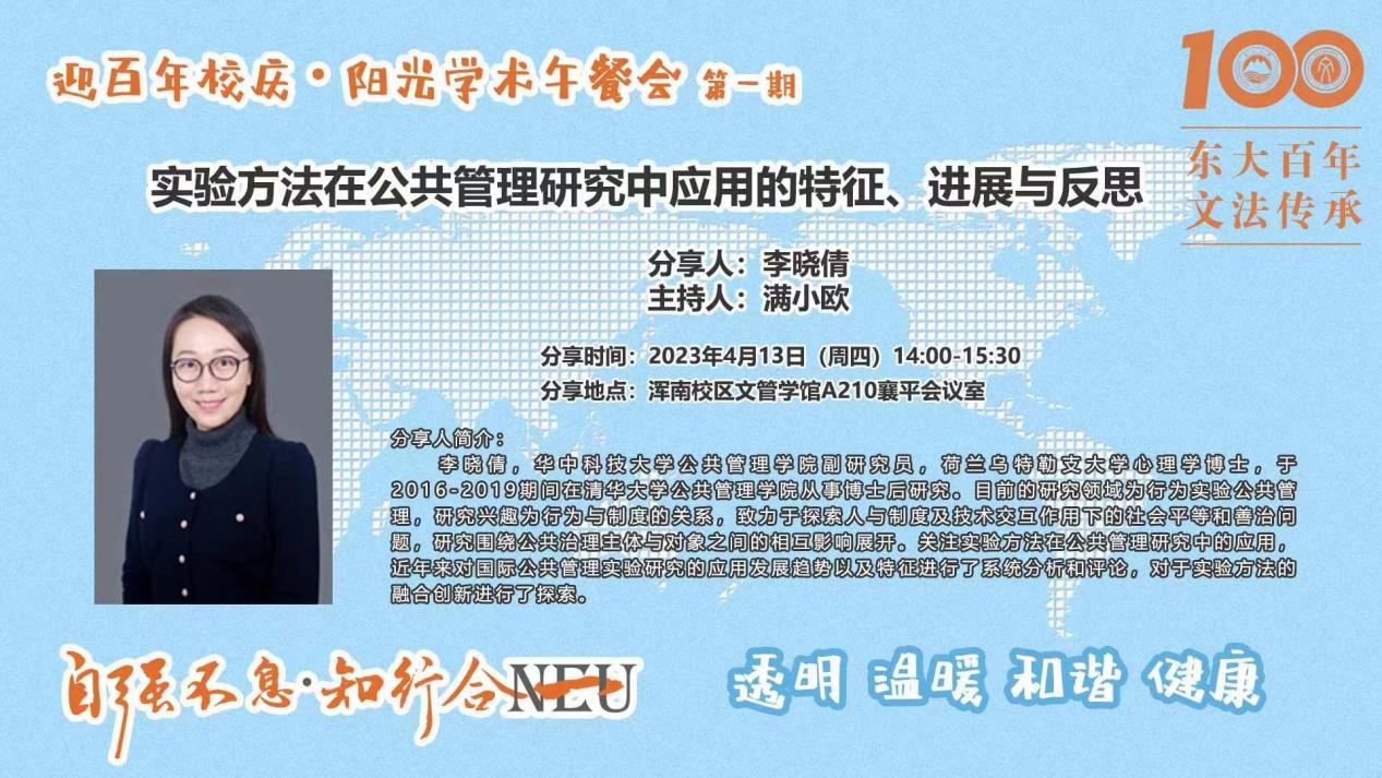2023年4月13日14:00,文法学院第一期“迎百年校庆·阳光学术午餐会”于文管学馆A210成功举办,华中科技大学公共管理学院副研究员李晓倩应邀作《实验方法在公共管理研究中应用的特征、进展与反思》线上主题分享。文法学院土地资源管理系雷国平、吕晓、刘馨蕊老师,行政管理系王颖老师,公共事业系刘钊老师和学院研究生代表参加了此次活动。活动由公共政策研究所满小欧老师主持。