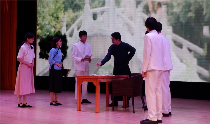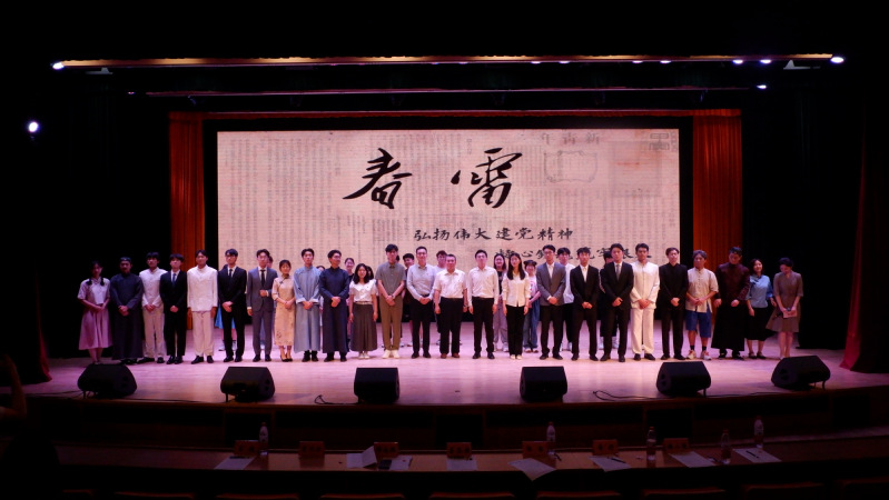 表彰大会结束后,由校党委组织部、文法学院和跨文化战略研究院共同打造的大型党史题材话剧《春雷》(文法学院专场)在观众热烈的掌声中拉开序幕。该剧展现了从新文化运动到中国共产党建立这段波澜壮阔的历史画卷,反映了共产党人矢志不渝的努力。多个学院学子携手同心,共同演绎了这场生动的话剧“党课”。从剧本创作到舞台表演,从服装化妆道具到背景图片视频,无不彰显了同学们的热忱和真心。