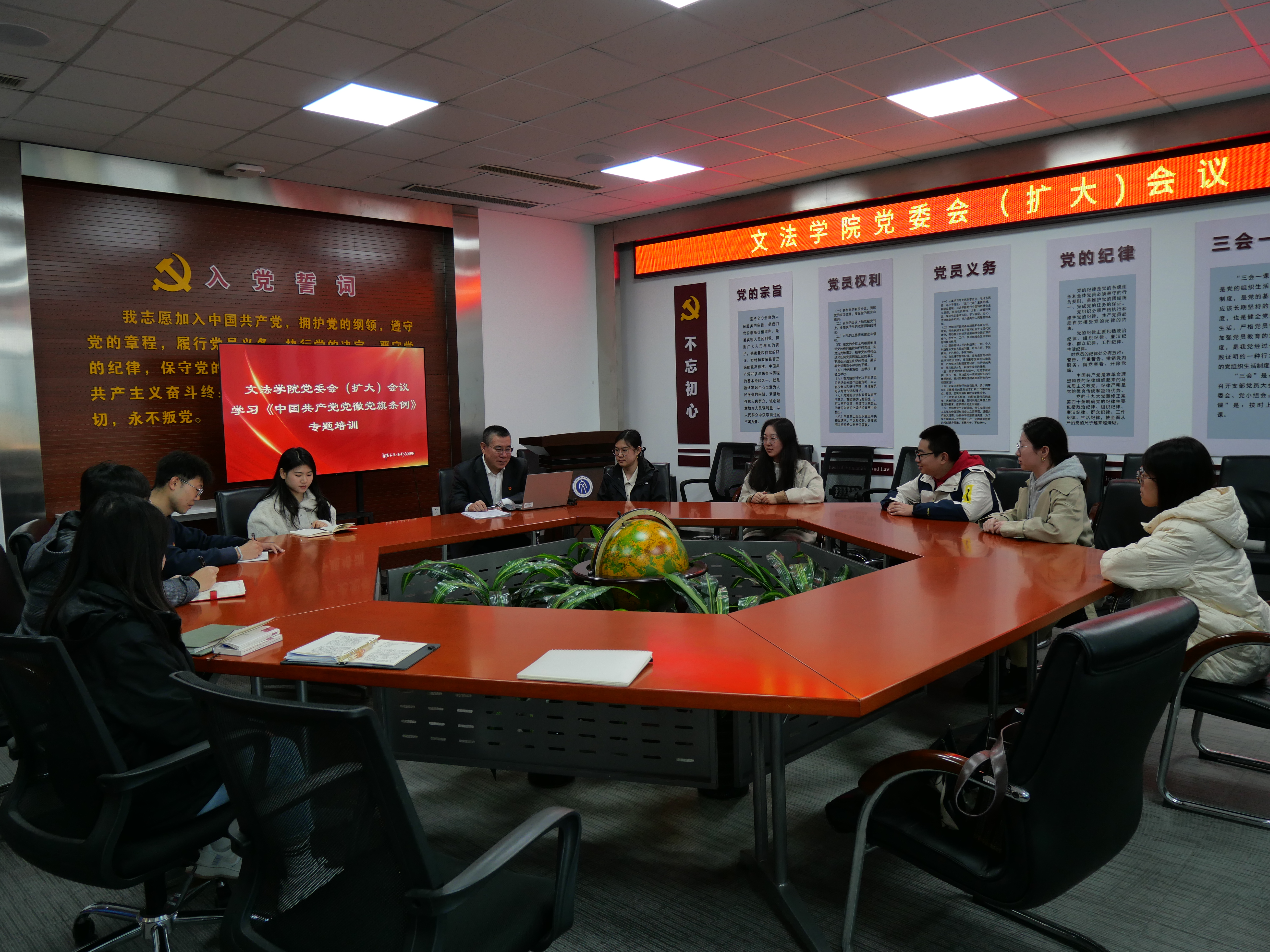 10月18日下午1:00,文法学院党委在文管学馆A202召开会议,集中学习《中国共产党党徽党旗条例》。文法学院部分党委委员、全体支部书记和党务工作者参会,会议由学院党委书记隋永强主持。