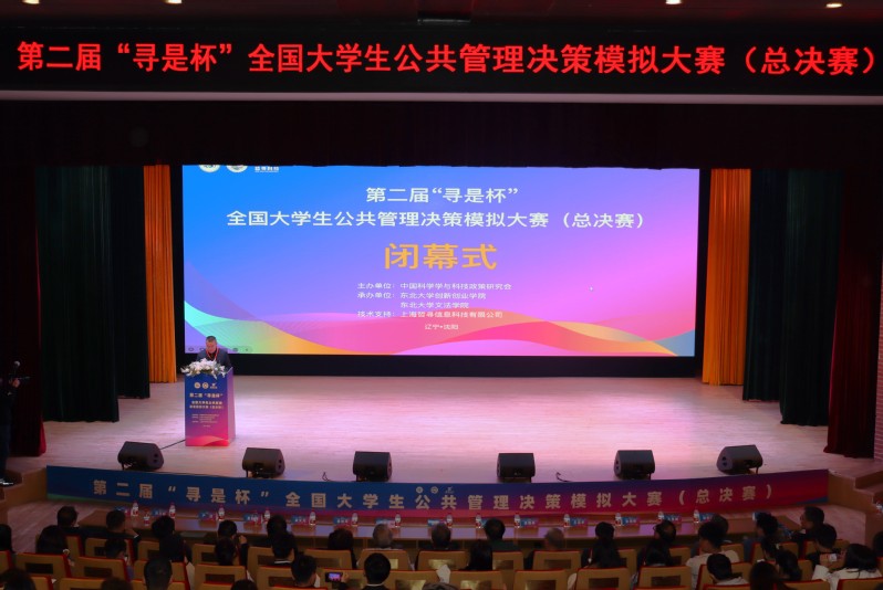 29日上午,第二届“寻是杯”全国大学生公共管理决策模拟大赛(总决赛)举行闭幕式。中国科学学与科技政策研究会副理事长胡志坚,武汉大学珞珈学者特聘教授丁煌,复旦大学国际关系与公共事务学院教授竺乾威,湖南农业大学公共管理与法学学院教授徐晓林,四川大学公共管理学院教授姜晓萍,北京大学政府管理学院副院长严洁,厦门大学公共事务学院教授黄新华,北京师范大学政府管理学院院长章文光,吉林大学行政学院院长张贤明,清华大学公共管理学院副院长王亚华,中国人民大学公共管理学院副院长杨宏山,南京大学政府管理学院院长孔繁斌,中国科学学与科技政策研究会理事刘兰剑,中国科学学与科技政策研究会副秘书长籍斌,上海哲寻信息科技有限公司总经理尹朝辉,东北大学文法学院院长张雷,东北大学文法学院副院长杜宝贵,东北大学文法学院党委副书记、副院长夏风云等出席。东北大学文法学院党委书记隋永强主持闭幕式。
