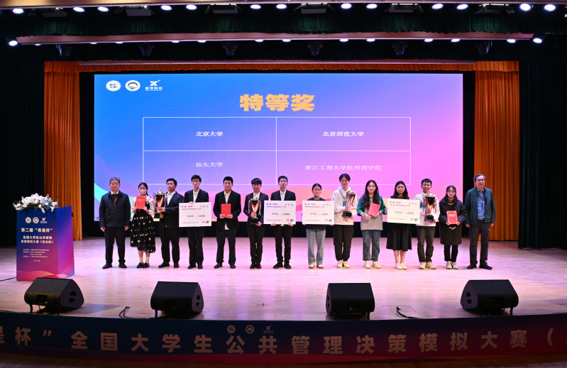 隋永强宣读比赛结果并宣布大赛闭幕。北京大学等8所高校团队获得特等奖,东北大学等28所高校团队获得一等奖,武汉大学等35所高校团队获得二等奖。最佳公共管理方案奖、最佳公共管理模拟决策奖、最佳团队奖分别由东北大学、兰州大学、北京大学等共9所高校团队摘得。