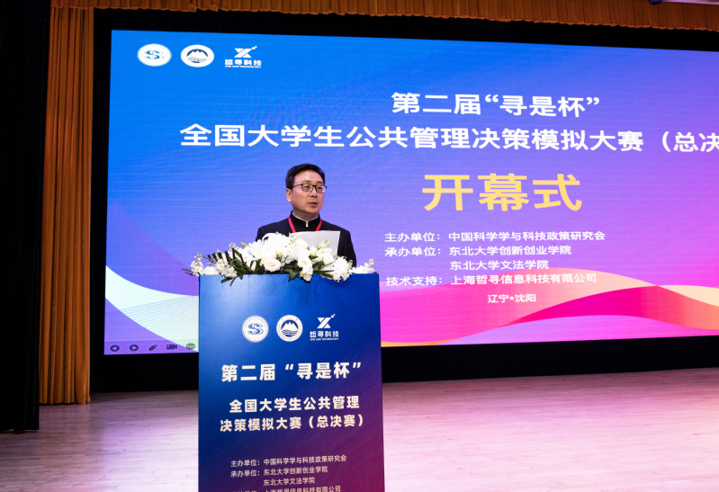 28日上午,第二届“寻是杯”全国大学生公共管理决策模拟大赛(总决赛)开幕式在东北大学浑南校区图书馆泰山学术报告厅举行。中国科学学与科技政策研究会副理事长胡志坚,中国科学学与科技政策研究会常务理事陈光,中国科学学与科技政策研究会理事刘兰剑,中国科学学与科技政策研究会副秘书长籍斌,上海哲寻信息科技有限公司总经理尹朝辉,东北大学党委副书记、纪委书记吴豪伟,东北大学文法学院党委书记隋永强,东北大学创新创业学院副院长王刚,东北大学文法学院副院长杜宝贵、李丹,东北大学文法学院党委副书记、副院长夏风云及各院校参赛师生出席开幕式。开幕式由东北大学文法学院院长张雷主持。