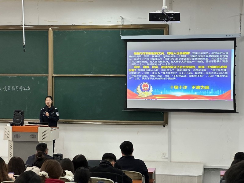 随后,杨丽楠警官根据具体的案例,围绕电信诈骗的特点、常见套路以及遭遇被骗了怎么办等要点进行讲解和介绍。通过播放视频、案例讲解等方式向在场师生形象生动地讲述了网络贷款陷阱、植入手机木马、博彩娱乐等多种电信诈骗手段。警官告诫师生,一定要谨记“天上不会掉馅饼”,不要将个人信息、短信验证码、支付密码等内容告知他人,如遇可疑情况应当及时报告派出所,或拨打“110”报警。