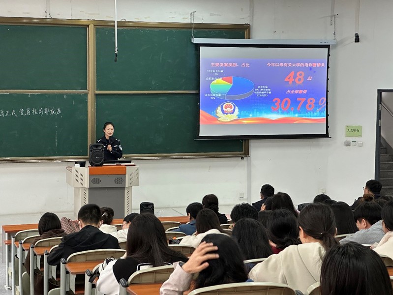 2024年4月15日,沈阳市公安局浑南分局浑南新城派出所杨丽楠副所长到文法学院为我院师生进行反诈宣传安全教育宣讲。