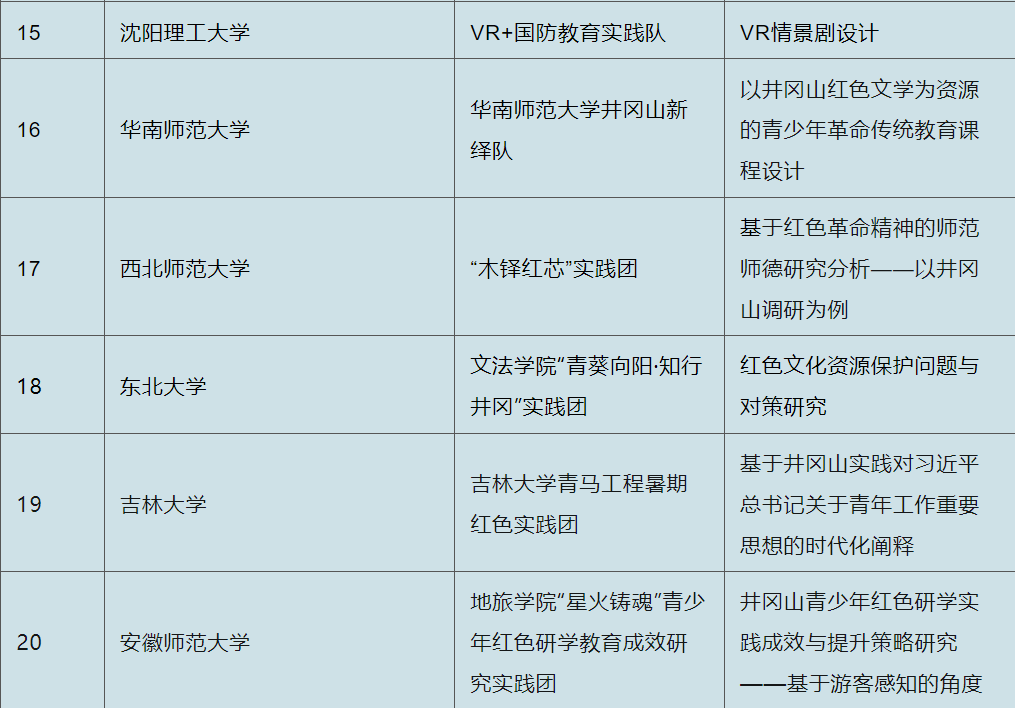 据悉,“井冈情·中国梦”全国大学生暑期实践季专项行动自2013年启动,已举办10年,累计开展70期。2023年“井冈情,中国梦”暑期社会实践活动从全国各地高校中遴选百余支实践团队分4期,每期400人左右开展实践活动。经过专家研究评审,最终评选出“优秀课题成果”38件;获评“优秀课题成果”的实践团队所在院校,如继续参加2024年“好课题”征集活动,可直接入选。