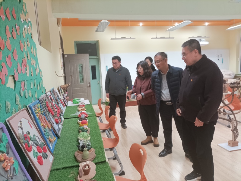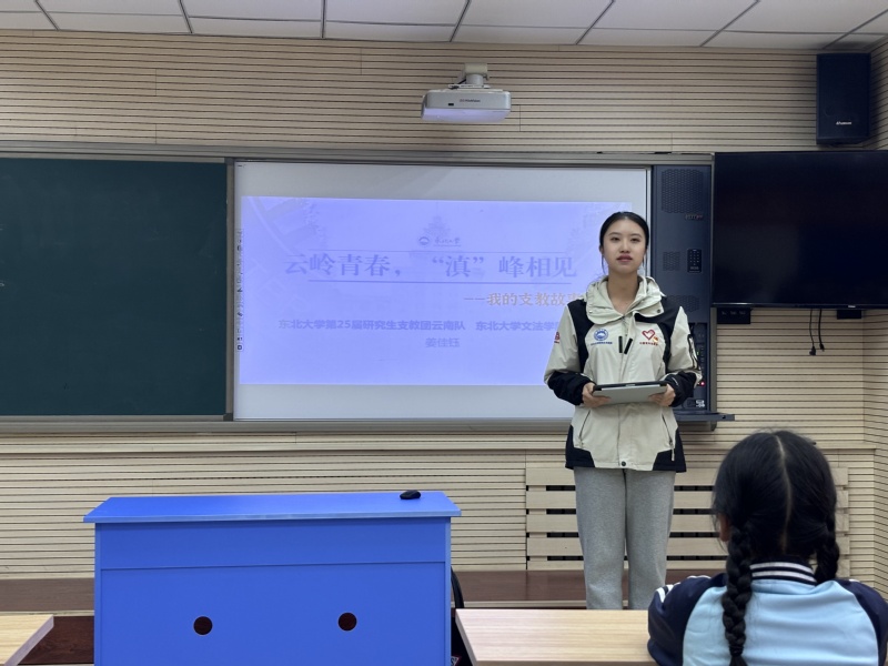 座谈会结束后,与会人员前往深井子小学进行调研,参观学生美术展览,了解学校办学特色。东北大学第25届研究生支教团云南队成员姜佳钰同学为小学生们作成长报告,分享了自己在支教过程中的工作经历和志愿服务心得体会。在双方交流环节,小学生们针对支教和大学生活踊跃提问,姜佳钰和发展对象们进行了一一解答。