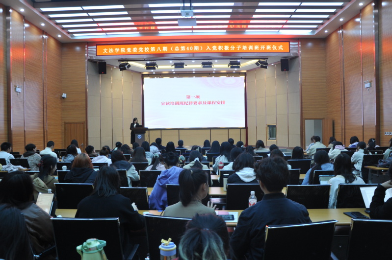 4月9日,开班仪式于文管学馆B230会议室举行,文法学院党委副书记、副院长(兼)严立宁,学生工作办公室主任甘霖等出席开班仪式,全体学员参加仪式。学院党委组织员刘颖慧介绍了本期培训班的纪律要求及课程安排。学员代表李逸然表达了对党的崇高敬意和加入党组织的坚定决心,表示将严守培训纪律、汲取理论知识养分,以实际行动向党组织靠拢。