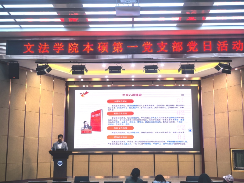 5月7日,文法学院本硕第一党支部在文管学馆B230会议室开展中央八项规定精神学习教育专题党课,文法学院院长杜宝贵出席并讲授专题党课,支部在校党员和入党积极分子参加了专题党课学习。