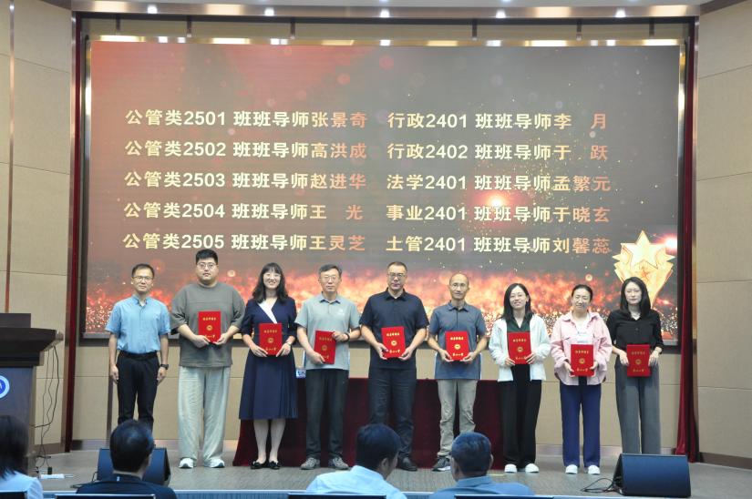 会议第三项,开展班导师聘任仪式,学院党委副书记、纪委书记孙宏伟宣读聘任文件,吕晓副院长为张景奇等10位班导师颁发聘书。