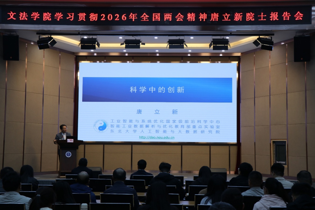 为深入学习贯彻2026年全国两会精神,深入开展树立和践行正确政绩观学习教育,4月15日上午,文法学院于浑南校区文管学馆B230会议室召开学习贯彻2026年全国两会精神报告会,学院邀请全国人大代表、中国工程院院士、校党委副书记、副校长唐立新为师生作2026年度全国两会精神专题辅导,报告会由学院党委书记隋永强主持。